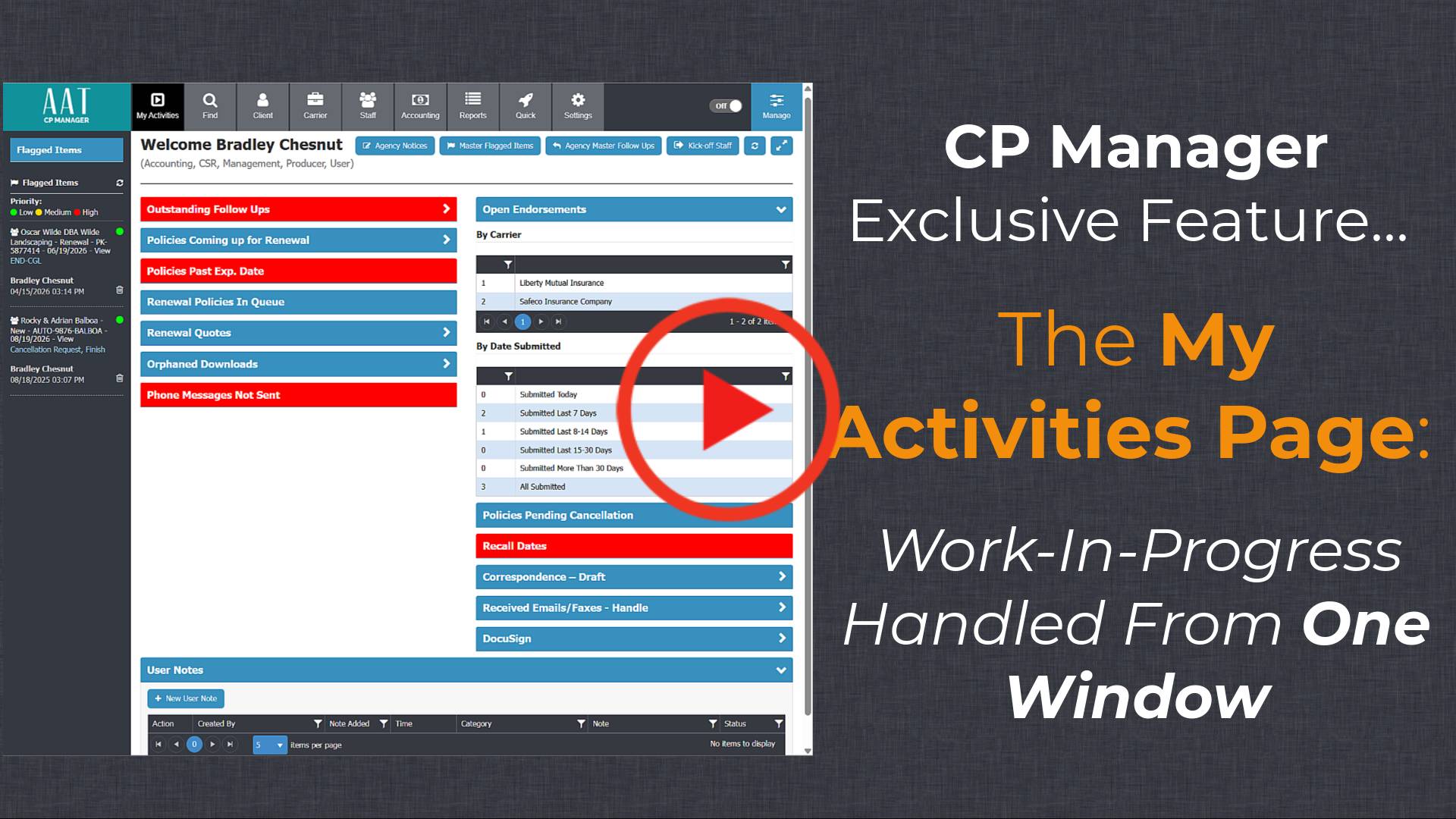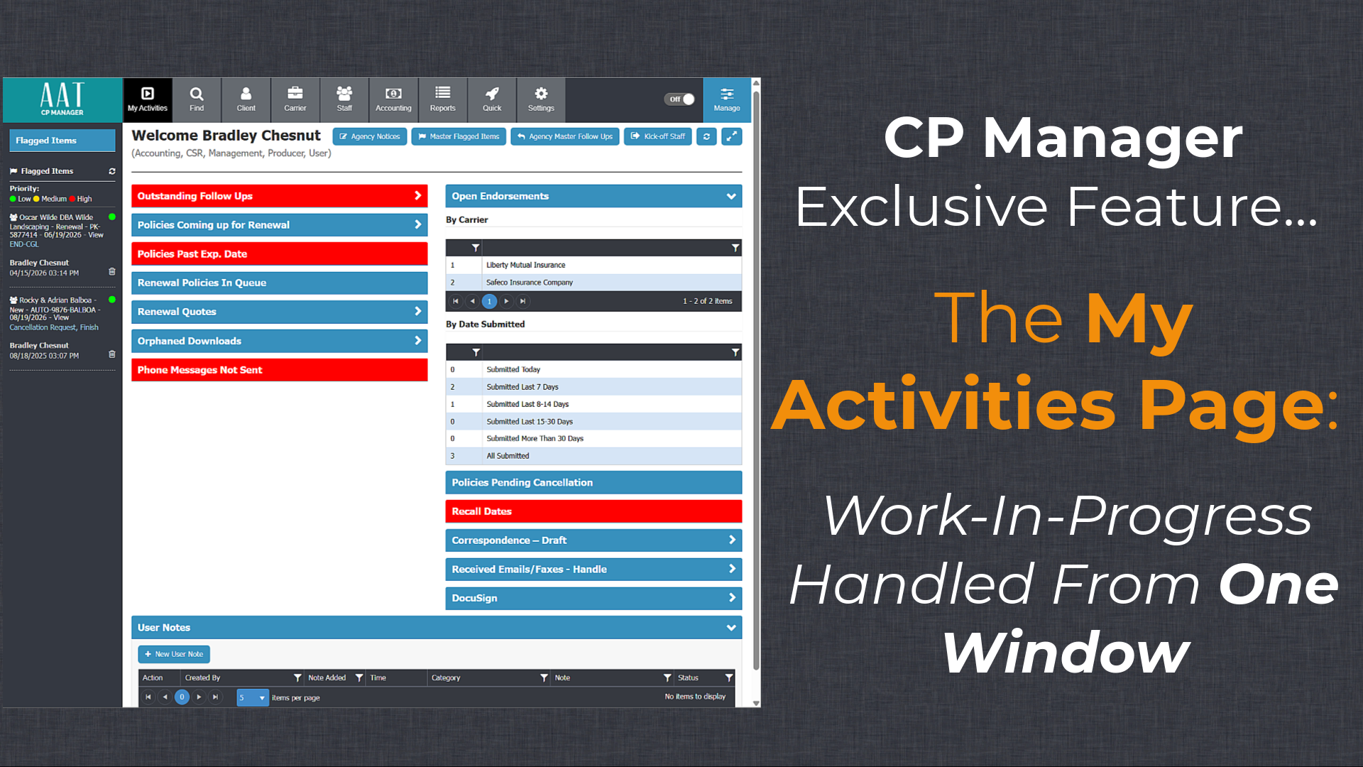 - The Workflow Cure: CP Manager is designed around how CSRs process their work, and key part of their job is staying on top of work in progress. To support this, we created the My Activities window. Every open loop, every uncompleted policy tasks, and every follow-up is tracked in one place. You move from "hoping" nothing fell through the cracks to knowing exactly where every outstanding policy task stands and staying on top of your other work.